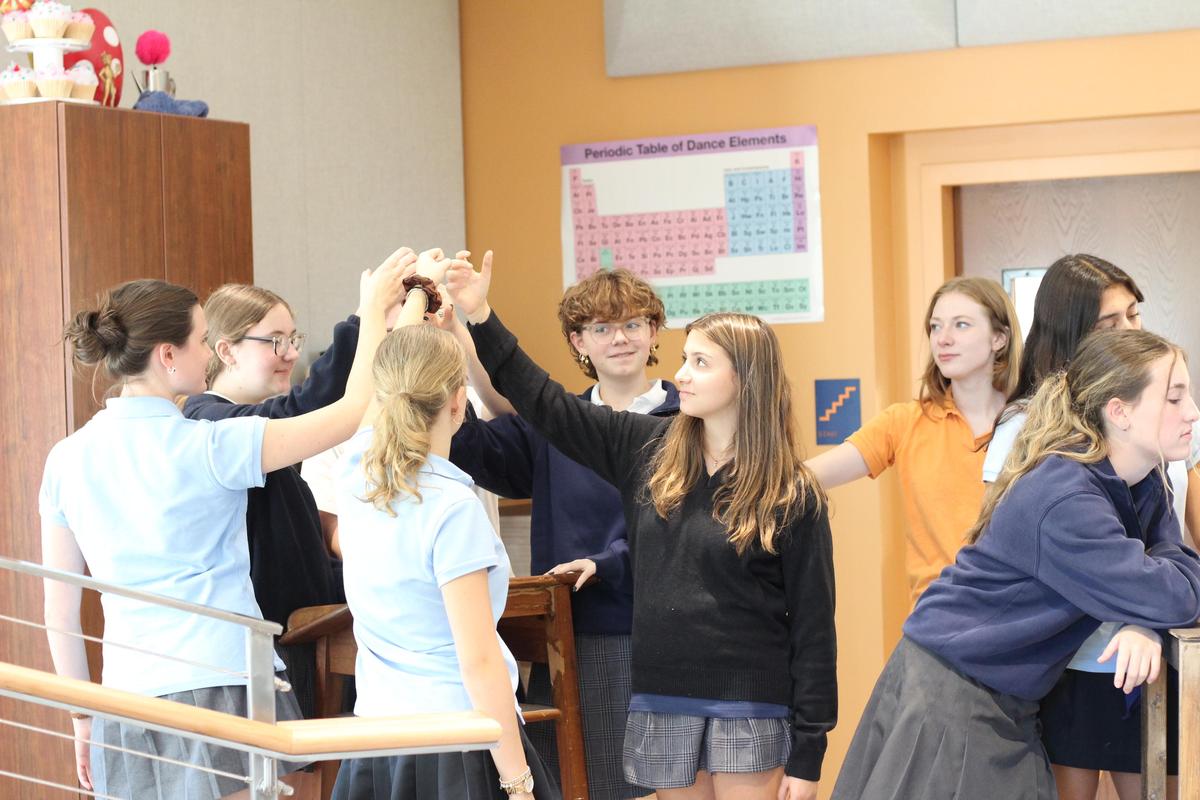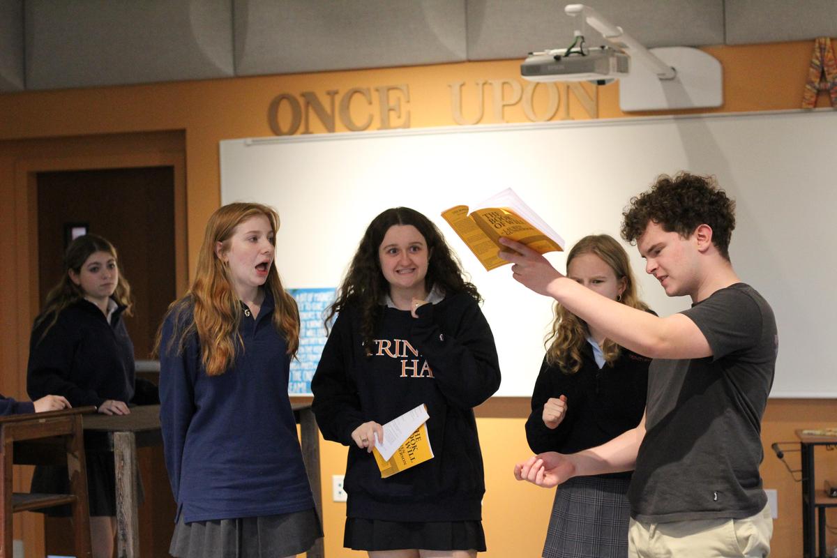 The set design also offers a creative twist on the play’s literary theme. “I’m excited for the sets,” Phillips added. “Our theme is books because of Shakespeare, so we suggest all the places we are going through the use of books.” Kailyn Lehan ‘26, who, along with Ava Santamaria ‘26 and Guadalupe Cardoso-Amador ‘26, has been leading the sets crew, shared, “The set crew has been working hard, and we are looking forward to the audience seeing all the unique set pieces we’ve created. Each part adds something special to the story, and I think people will really like the creativity and detail that went into it.”